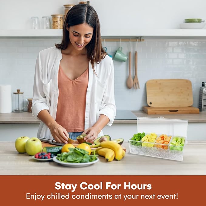 - Keeps Condiments Chilled: The ice-filled base helps maintain a cool temperature, keeping fruits, dips, and toppings fresh for hours. Suitable for bars, buffets, and gatherings