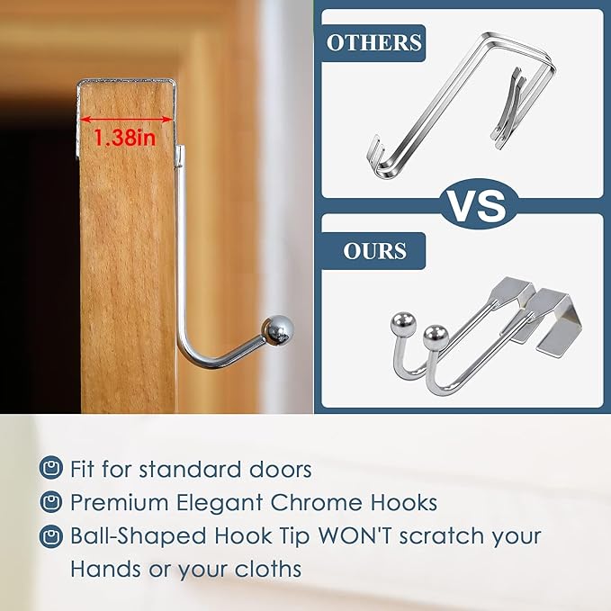 - 2 Wide Metal Hooks & Adhesive- The 1.38” wide over-door hooks are specially designed with BALL-SHAPED HOOK TIPS to avoid scratching clothes or fingers. Premium THICKNESS & WIDTH ensure the hooks hang stably on the door. They never deform, slide out of place, or scratch your door easily like those cheaper hooks. Two damage-free adhesives are included for your use.