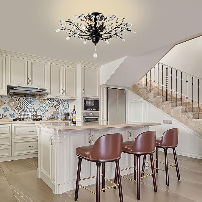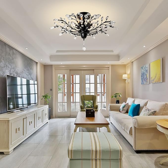 - CLASSIC DESIGN: This black ceiling light is beautifully decorated. Use transparent glass crystals to capture and reflect the light of the bulb, sparkling and shiny light effect to created a warm and soft atmosphere.