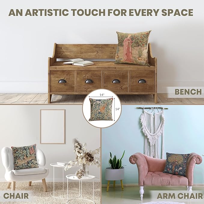 - Timeless Durability: Elevate your decor with our skin-friendly William Morris pillow covers 14”X14”, where quality and style come together. A sturdy hidden zipper ensures easy pillow insertion/removal, while the overlock stitches prevent seam ripping. Unlike thin printed cushion covers prone to tearing, our decorative pillows for couch with a super-soft backside are crafted with thick premium threads for long-lasting quality. THE PACKAGE INCLUDES A SINGLE TAPESTRY PILLOW COVER WITHOUT AN INSERT