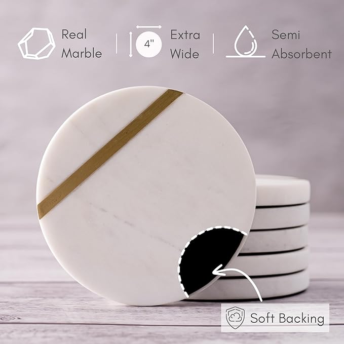 - An Elegant Accent - Our white and gold coasters pair the classic simplicity of marble with a gold brass inlay for a glam modern touch. Get ready for compliments on these quality elegant coasters.