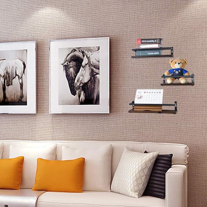 Floating Shelves Rustic Wood Wall Mounted Shelf Practical Metal Fence Design Ideal for Bedroom, Bathroom, Kitchen Set of 3(Brown)
