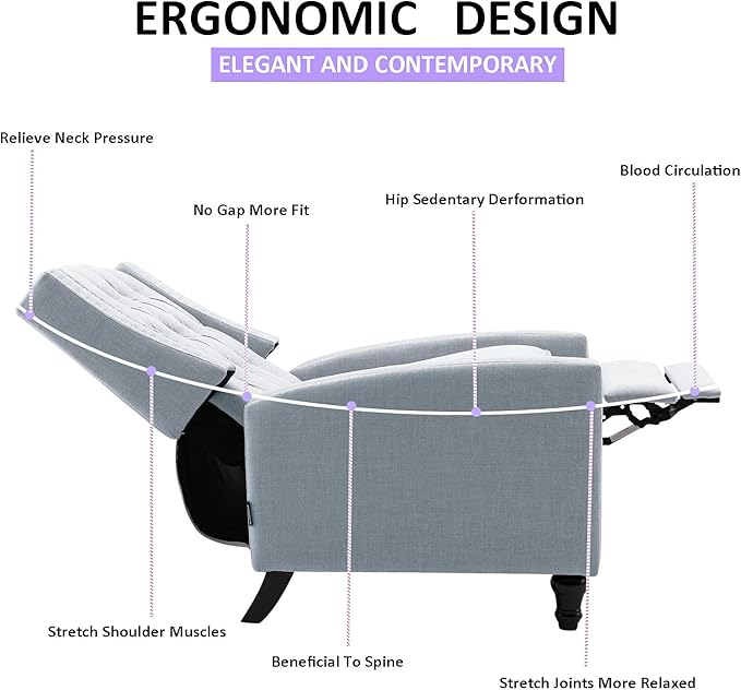 - 🐇➤【BRINGS OUT THE BEAUTY OF ANY ROOM】Create a cozy reading nook with a single recliner chair or position a pair by the fireplace to make a grandiose statement. Our push back recliner works equally well in an elegant bedroom or a masculine study.