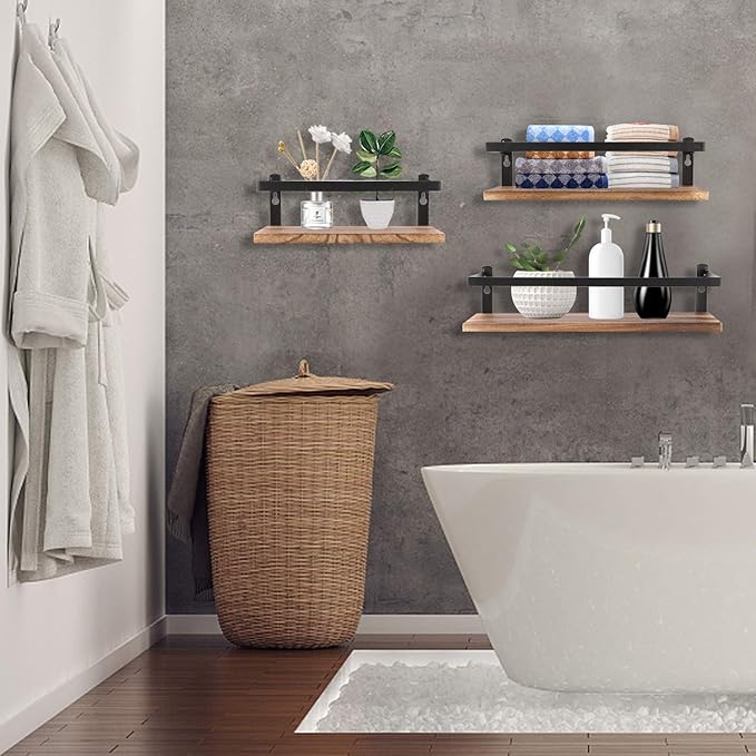 - 【THICEN BRACKET】:All the metal part of this black floating shelves is made from superior quality steel,the ironwork is anti-friction, order this wood floating shelves set for yourself or as a thoughtful housewarming gift idea for a special friend, and you’ll receive 3 rustic wall mounted shelves, sized 17” x 5.6”, 14.5” x 5.6” and 11” x 5.6” to suit all your needs!metal brackets,