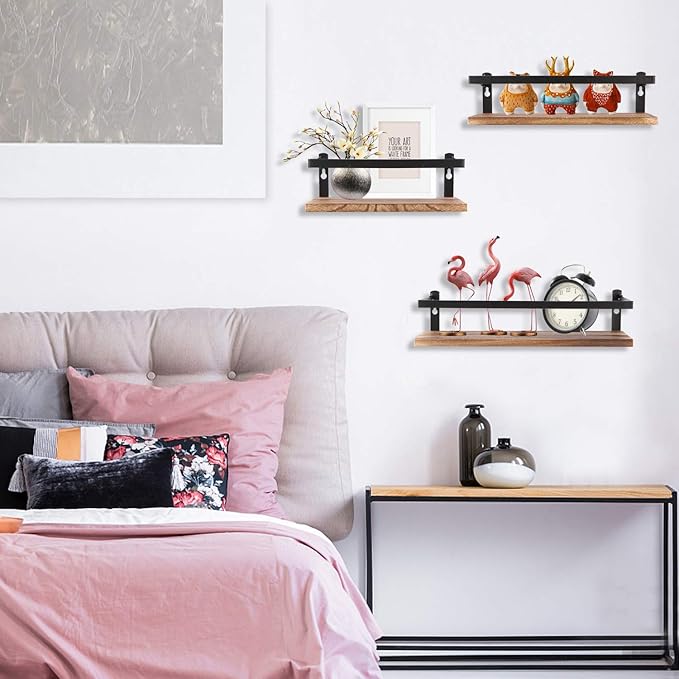 - 【INNOVATIVE DESIGN】: Unlike similar products on the market, these wooden shelves for wall come with a unique design which includes a metallic fence, preventing your delicate items from dropping and breaking! By special process,the fence is ,it won’t be scratched by long time use and always looks grace.