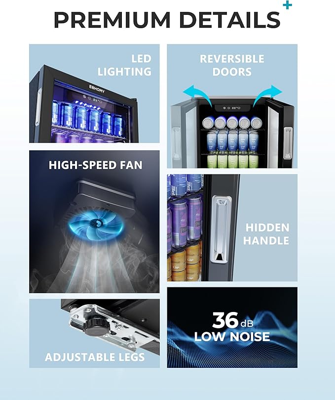- QUIET + ADVANCED COOLING SYSTEM - With a powerful compressor and internal air-cooled system, Euhomy’s mini fridge creates an evenly cooled space by ensuring that air flows throughout the entire beverage center.In addition, ultra quiet cooler of beverage cooling machine doesn’t affect your daily rest or working. With our cooler, you won’t just enjoy cold drinks, you’ll have a quiet atmosphere too