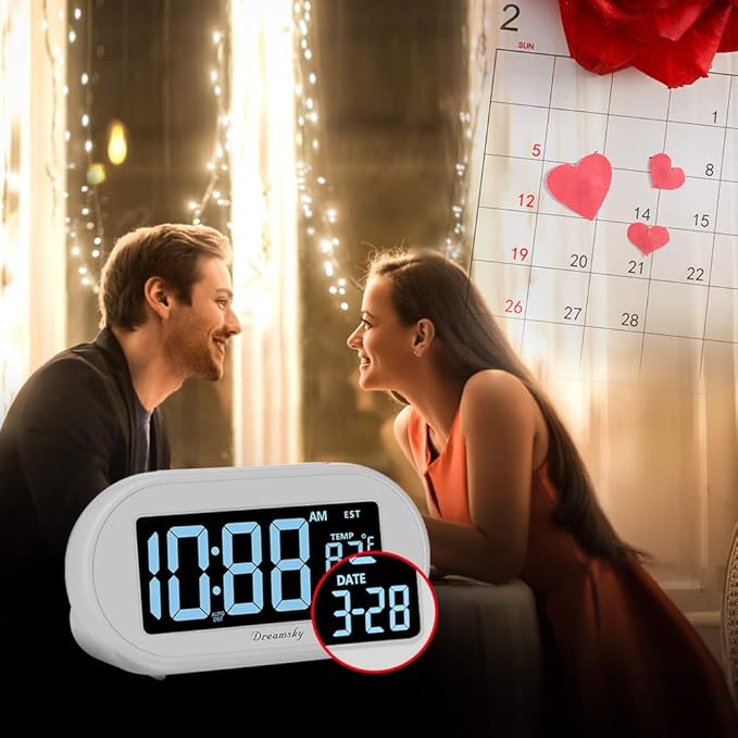 - Auto Setting Alarm Clock with Full Range Dimmer: 4.3 Inches large LCD screen displays eye easy catch blue digit, time and date are easy to read at a glance. 0%-100% adjustable dimmer enable you to set the brightness of display to a comfortable level at will. The digital alarm clock is perfect small gift for kids elderly senior.