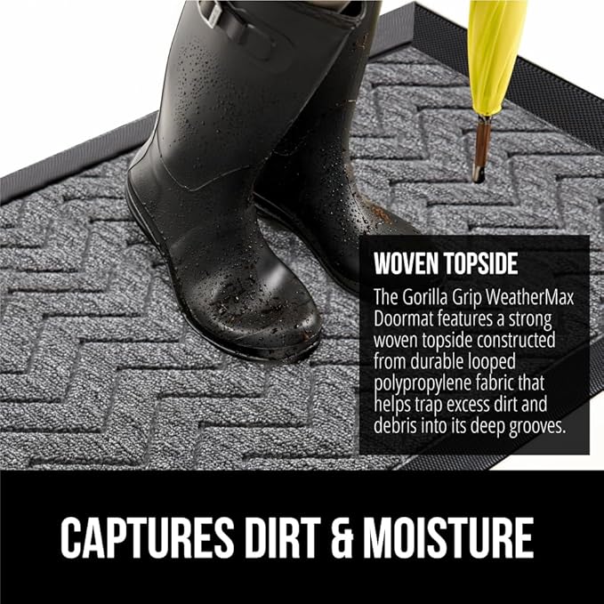 - Heavy Duty All Weather Doormat: The Gorilla Grip WeatherMax doormat is durably designed to withstand all weather conditions, from snow and rain to mud and sand; the all season mat features deep grooves that help capture moisture, dirt and debris