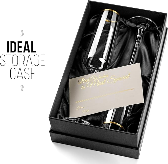 - EXQUISITE TOASTING FLUTES – if you are looking for an extraordinary pair of champagne glasses to toast one of the life’s special moments such as engagement, wedding, anniversary, graduation or big birthday these crystal flutes will surely add a golden sparkle to the beautiful toasting experience and future celebrations.