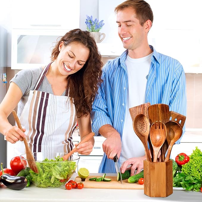 - 【100% Natural High-Quality Material】 Wooden kitchen utensil set is made of 100% handmade with natural teak.The material is strong and durable,it will not crack or deform and you can use it for a long time. It also has beautiful and unique wood grain.Give your kitchen a high-end atmosphere.