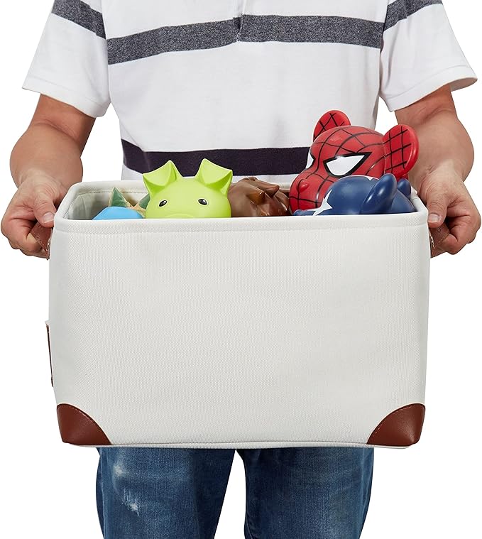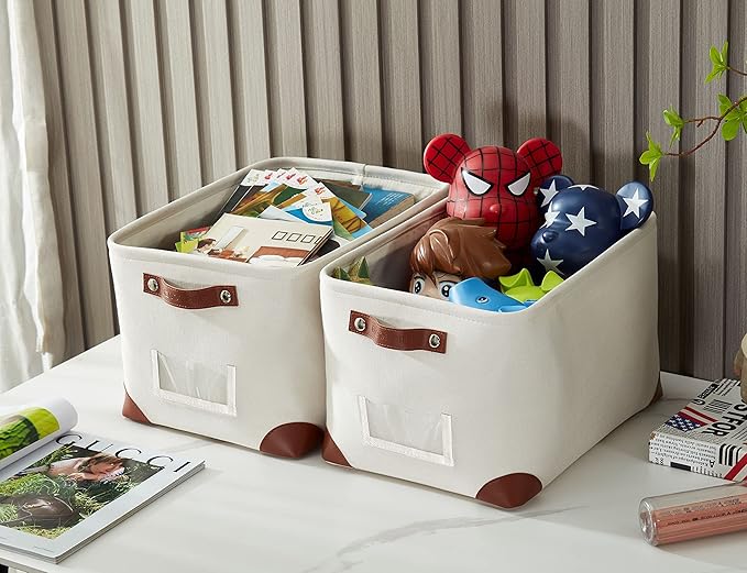 - Label & Organize: This basket features a label holder to help you find items without pulling out the bins each time. The luxurious canvas exterior fabric, faux leather handles and corner feet are designed for a modern and elegant feel.