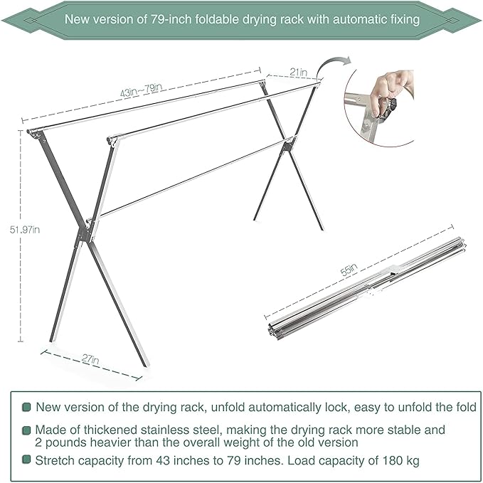 - [ NEW VERSION ] The new version of the drying racks for laundry foldable is fully upgraded. The gravity lock structure on the top is stronger than the triangular design. It weighs 9 pounds and has a heavier texture than ordinary laundry drying rack, will not bend or break.