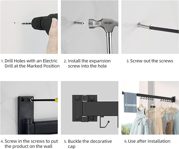 - ✅ Punch-free & Drilling Installation to Choose -- Whether you prefer a punch-free installation (With No-Drill Adhesive: Clothing Weight⩽60 LBS) or traditional drilling, our clothes drying rack wall mounted offers simple installation methods suitable for various surfaces, including smooth ceramic tiles, ensuring it fits perfectly in your space. (Tips: Please make sure the wall or wood board is solid before installation.)