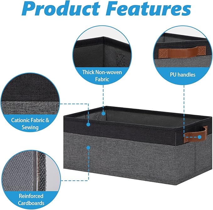 - 👍【QUALITY MATERIAL】Storage baskets for shelves are made of high-quality cationic fabric and polyester cotton fabric, and the inner layer is made of non-woven fabric, which is odorless, long-lasting and strong. Classic faux leather handles that adds a comfortable touch and provides a strong and comfort grip to pull and move. Fabric storage bin is easy to clean, just wipe with a damp sponge or cloth