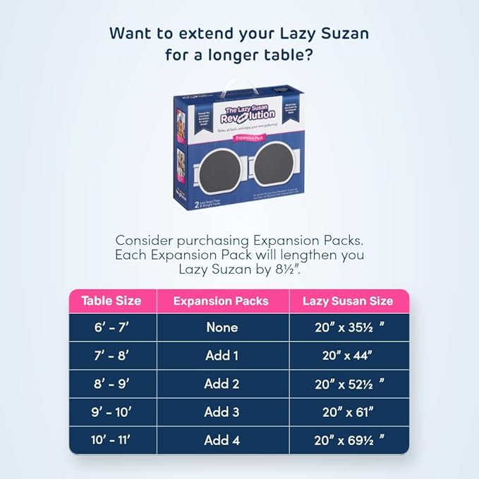- βΎοΈ EASILY EXPANDABLE FOR ANY TABLE SIZE- This lazy susan turntable is easily expandable. Extra trays, which are available separately, can be added. The lazy susan extension allows you to extend your Lazy Susan Revolution to any table size.