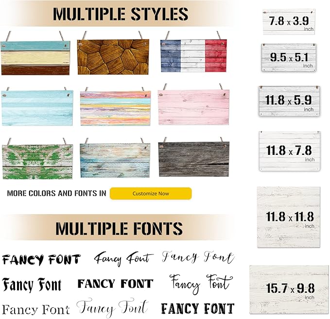 - 🟢Multiple Sizes and Backgrounds - We provide up to 100 different wood plank background colors, 20 different fonts and 50 font colors (in "Customize Now"), you can choose the one you like to design