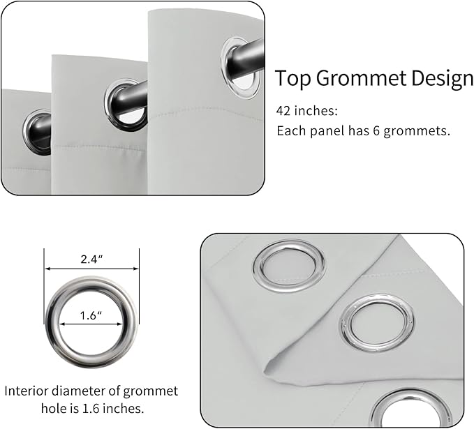- Easy to Install: Each curtain panel has 6 silver metal grommets on top. Each grommet inner diameter is 1.6 inch, fits easily with standard curtain rods. Easy to hang, and slide smoothly. Perfect for office, bedroom, living room.