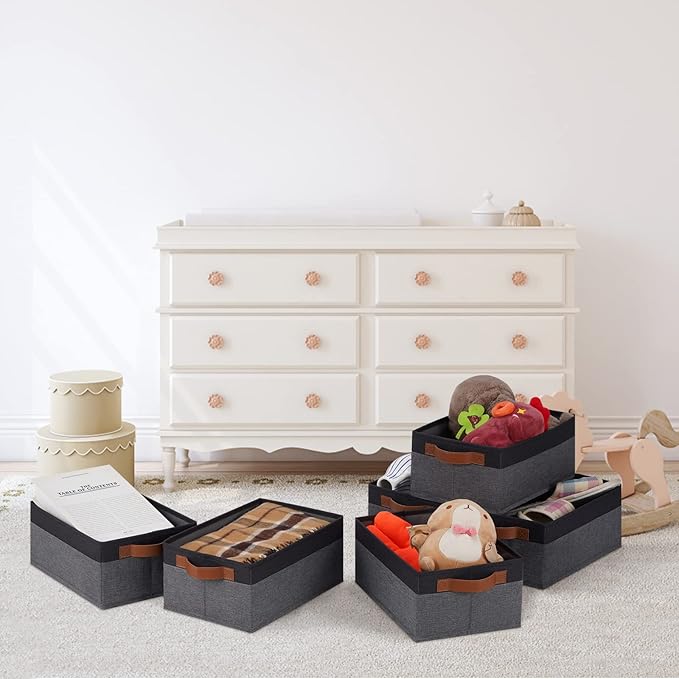 GhvyenntteS Small Fabric Storage Bins 12 Pack, 11.8" x 7.87" x 5.11" Storage Basket with Leather Handles, Closet Storage Bins for Shelves, Storage Baskets for Shelves, DVD Storage (Grey/Black)