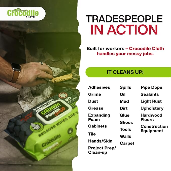 - Hand Safe: Crocodile Cloth wipes are dermatologically tested and infused with aloe and vitamin E to be safe for your hands while eating through grease and oil. Every disposable wipe is formulated to stay wet outside the package for over an hour.
