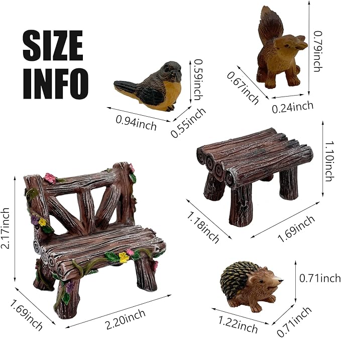 - FAIRY FIGURINE. A set of 10 pcs, including fairies figurines, forest animal miniatures, and benches. Perfect for fairy garden decor. A must-have among fairy garden accessories. For backyard garden decor, flower beds, lawn ornaments, patio table... Different in appearance and expression, they can be used individually or as a group.
