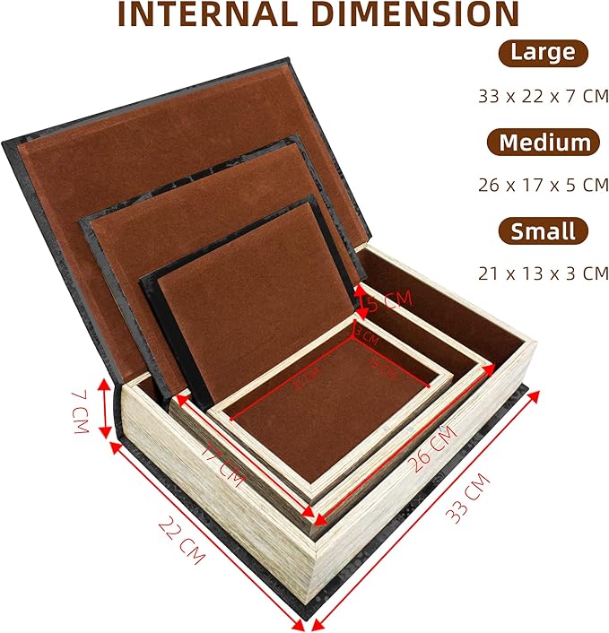 - This set of fake book boxes consists of three large, medium and small boxes. Large Book Box: External Size: 13" × 8.5" × 2.75"/ Internal Size: 11.7" × 7.5" × 2.3" Middle Book Box: External Size: 10.2" × 6.5" × 1.9"/ Internal Size: 8.8" × 5.5" × 1.5" Small book box: Outer size: 8.2" × 5" × 1.1"/ Inner size: 7" × 3.9" × 0.8"