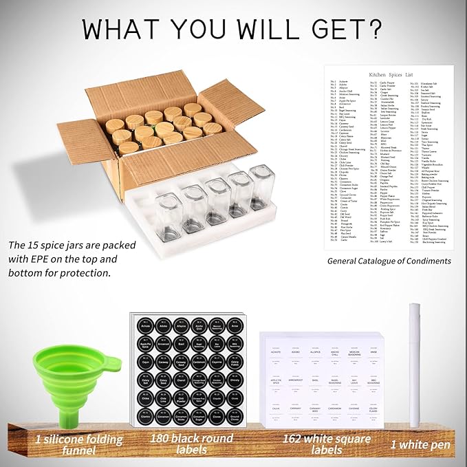 - Complete 4 oz Spice Jars Set: This set of spice jars contains: 36 4oz glass spice jars with bamboo lids, 1 complete list of spices, 180 black round labels, 162 white square labels, 1 white pen , 1 silicone folding funnel for refilling