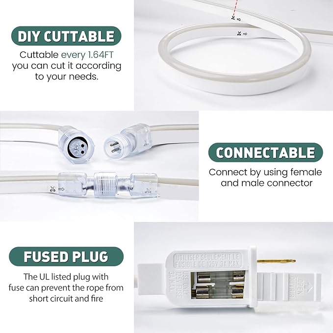 - ETL Listed & High Quality --The power plug of our led rope light is UL listed. Built-in fuse design for increased safety and reliability. GZBtech vivid neon rope light uses high-quality120 LEDs/M SMD 2835 LED chips and PVC soft glue, smooth surface and anti-yellowing,without spots or dark dots,brighter light and low power consumption.