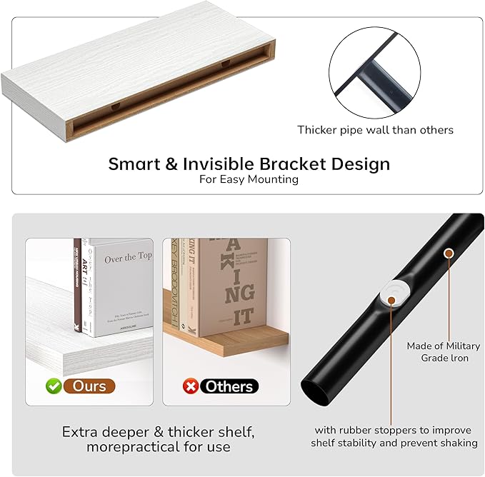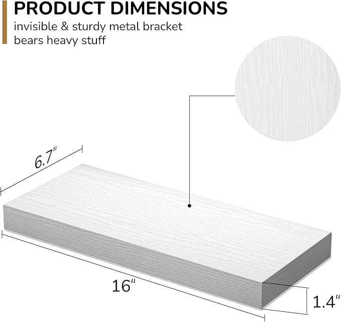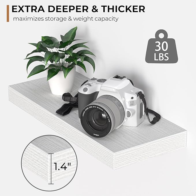 - Extra Deeper & Thicker - Each board measures 16"W x 6.7"D x 1.4"H. Extra deeper and thicker design in order to bring maximizes storage space and weight capacity, even hold up to 30 lb each. This floating shelf taking up zero square feet, reduces clutter and highlights décor in compact spaces.