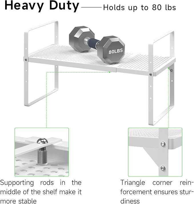 - Heavy-Duty: This pantry organizer, made of high-quality metal steel, has a load-bearing capacity of over 80 lbs. The coated layer makes the surface smooth, easy to clean, and rustproof. The anti-slip pads on the bracket prevent slip and ensures the shelf will stay in place.