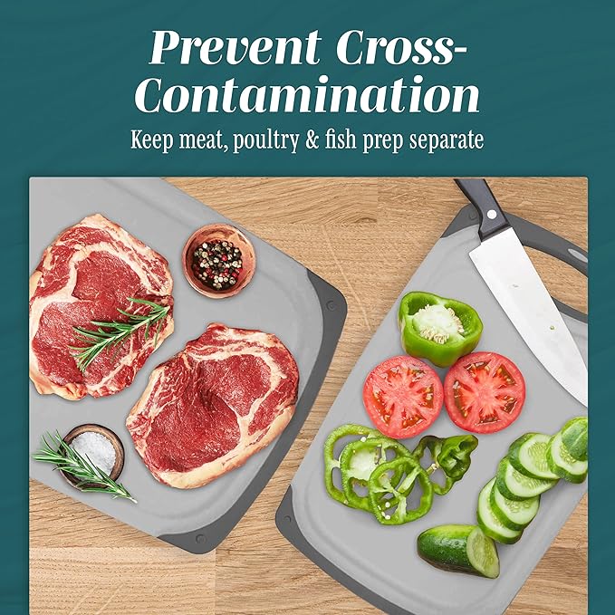 - VERSATILE COOKING - Our plastic cutting board set is great for every kind of chopping. Use it for fruit, as a meat cutting board, a fish cleaning station, or put it over the sink for extra counter space.