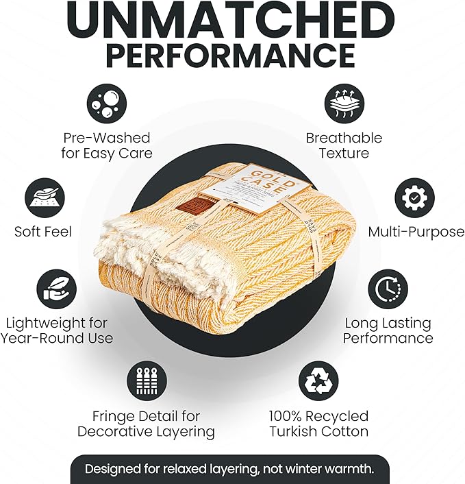 Gold Case Throw Blanket for Couch – 100% Recycled Turkish Cotton Blankets & Throws – Elegant Decorative Throw Blankets for Living Room Sofa – Woven Throws for Couch – Vintage Mustard – 50x60