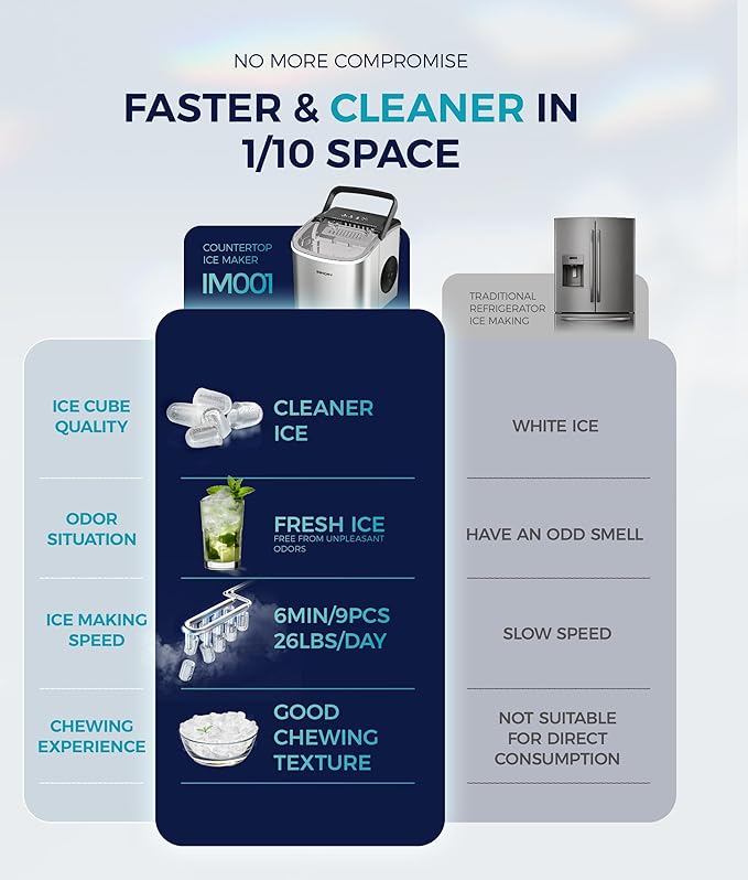 - 6 Mins Ice-Making & Ultra Quieter: Our Euhomy ice maker only takes 6mins that will enjoy the first batch of fresh bullet ice. With a 1.2L water tank and powerful compressor, the portable ice maker easily makes maximum ice capacity to 26lbs ice per day and holds up to 1.3lbs ice at a time. Also, our ice maker is not only excellent in refrigeration, but also at less than 45db normal noise, ensuring a comfortable and quiet environment to enjoy ice-making, similar to a working freezer