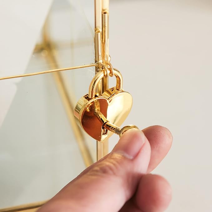 - Gold Wedding Glass Card Box - Add a touch of elegance to your home decor with our stunning Gold Wedding Glass Card Box. Featuring a slot on the top and a side lockable door with heart-shape lock, this glass card holder is perfect for any occasion, from weddings and parties to birthdays and more. The heart-shaped lock with key ensures safe and secure storage of your cards and other precious items.