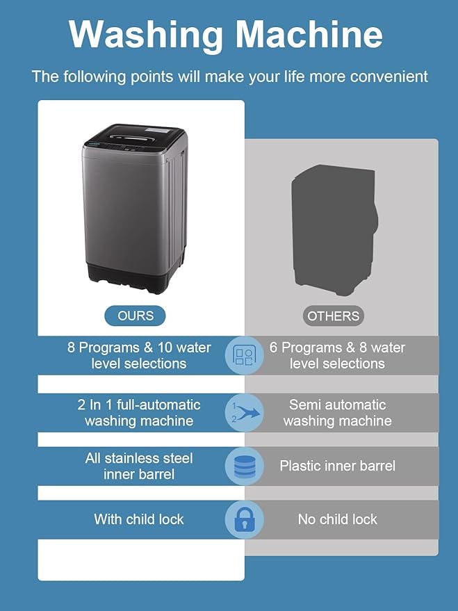 - 👗【Water Level and Mode Control】: 10Programs for choosing: wash-rinse-spin, soak-wash-rinse -spin, wash, wash-risne, rinse-spin, spin. You could adjust the different washing mode through the wash push-button and control the water level via the switch. Different clothes have different washing and water level requirement. You can stop wasting hours keeping an eye on washing machine for its full automatic clean mode.