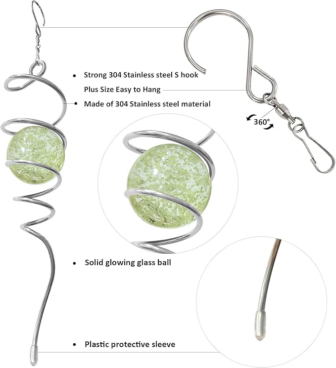 - 【Easy To Position】The Wind Spinner Stabilizer Spiral can't spin by itself ,if you want to make it spin like the video ,need add 1pc motor (not include) ,or combine it with a wind spinner or any rotatable hanging ornament to help it rotate. Come with 1pc 2 inch colored glass orb(not paint), 1pc silver color spiral tail twister,and 1pc swivel hook accessory, ready to hang and enjoy.
