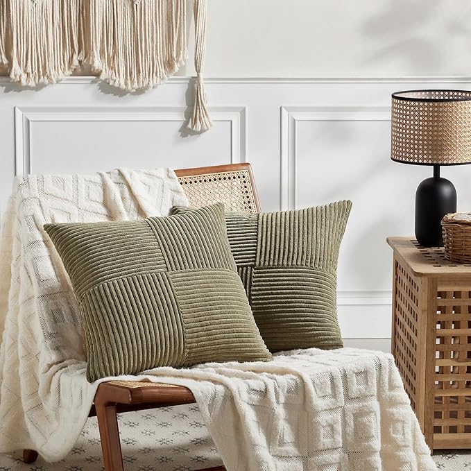 Fancy Homi 2 Packs Olive Green Decorative Throw Pillow Covers 20x20 Inch for Living Room Couch Bed Sofa, Rustic Farmhouse Boho Home Decor, Soft Corss Corduroy Patchwork Accent Cushion Case 50x50 cm