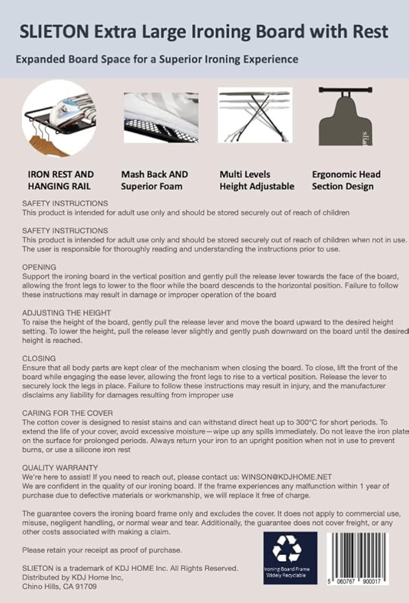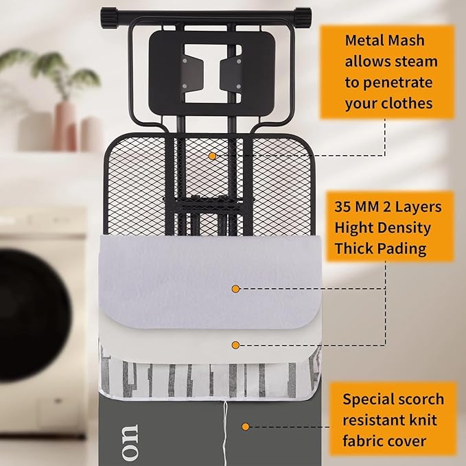 - Biggest Ironing Board on Market - Our extra-wide ironing board stands as one of the widest available on the market today. Its expansive design allows you to effortlessly iron larger sections of fabric in a single stroke, resulting in reduced shuffling and considerable time saved during your ironing chores.