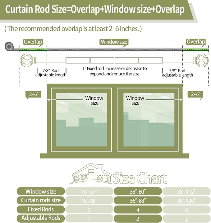 - Curtain Rods for Windows 48 to 84 inch(4-7ft): TANGWIN drapery rods include 4 x 16" x 1" fixed rods, 2 x 16" x 7/8" adjustable rods, 2 x finial,3 x bracket, 3 x connector, 6 x anchor, 6 x screw. Gold curtain rods for windows can extend from 36 to 88 inches, choose the right size curtain rods according to the length of your window.