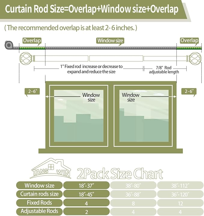 - 2 Pack Curtain Rods for Windows 28 to 48 inch(2.3-4ft): TANGWIN drapery rods include 4 x 16" x 1"fixed rods, 2 x 16" x 7/8"adjustable rods, 4 x finial, 4 x bracket, 2 x connector, 8 x anchor, 8 x screw. 2 Pack gold curtain rods for windows can extend from 18 to 45 inches, choose the right size curtain rods according to the length of your window.