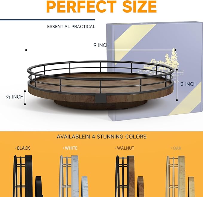 Farmhouse Oak 9" Lazy Susan Turntable Organizer for Cabinet, Round Wooden Lazy Susan Organization and Storage for Dining Table, Pantry, Kitchen, Countertop, Cupboard,Home Decor, Walnut Wood