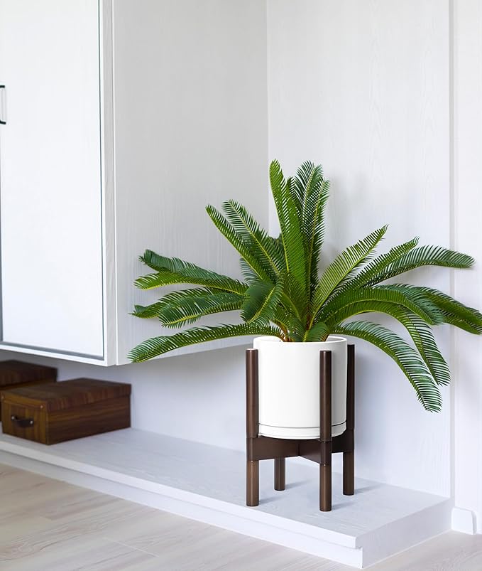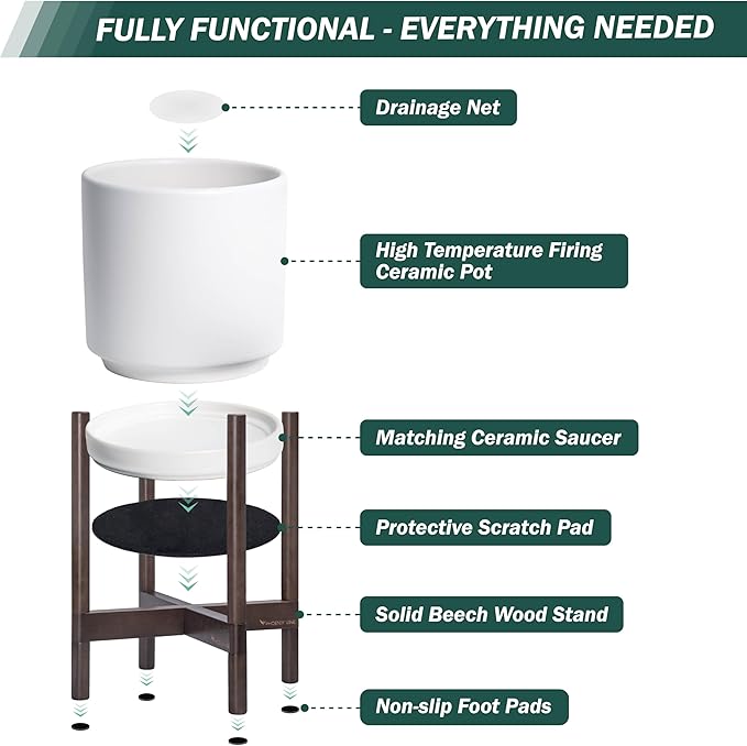 - A Complete Set: Mid-century ceramic planter, combined with a sculptural, solid wood stand that match perfectly together and looks great in anywhere.