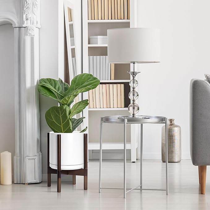 D'vine Dev Ceramic Planter with Walnut Color Stand - 10 Inch Modern Round Flower Pot with Wood Planter Holder, White, 55-B-X-1