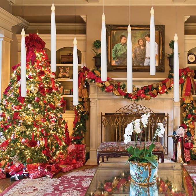 - Package Set: You will receive 12 packs of 10.8 inches tall and 0.79-inch diameter flameless floating candles with 4.9ft fishing line(barely visible) pre-attached to these LED taper candles ready to hang, 1 magical wand remote. Each floating candle is operated by 2 AA batteries(not included).