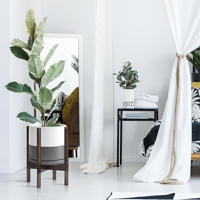 - A Complete Set: Mid-century ceramic planter, combined with a sculptural, solid wood stand that match perfectly together and looks great in anywhere.
