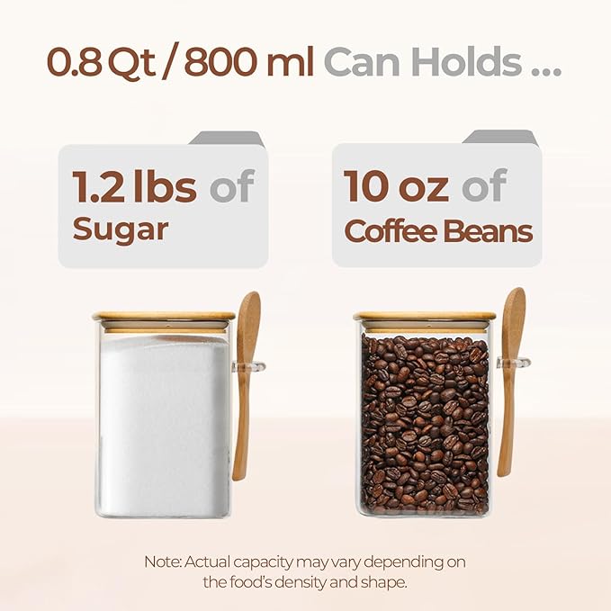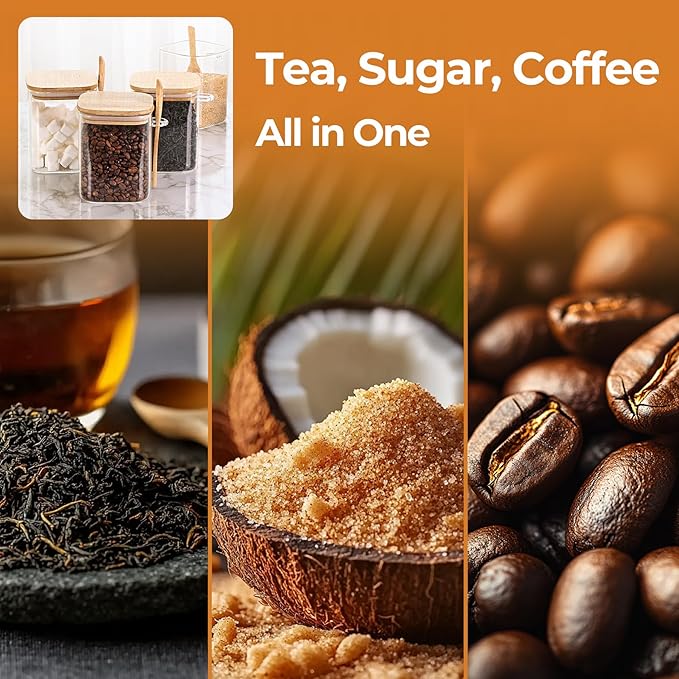 - Convenient and Versatile: The transparent glass of our square glass jar provides a clear view of the contents, making it perfect for storing various food like, pasta, oats, flour or tea, especially for coffee beans and sugar near your coffee machine; It will be a great addition to cocoa, hot chocolate, coffee bar; With the included spoon, it's easy to scoop and use your stored items efficiently, even for bath salt or tea storage