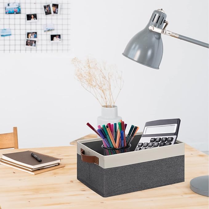 - 👍【QUALITY MATERIAL】Storage baskets for shelves are made of high-quality cationic fabric and polyester cotton fabric, and the inner layer is made of non-woven fabric, which is odorless, long-lasting and strong. Classic faux leather handles that adds a comfortable touch and provides a strong and comfort grip to pull and move. Fabric storage bin is easy to clean, just wipe with a damp sponge or cloth.