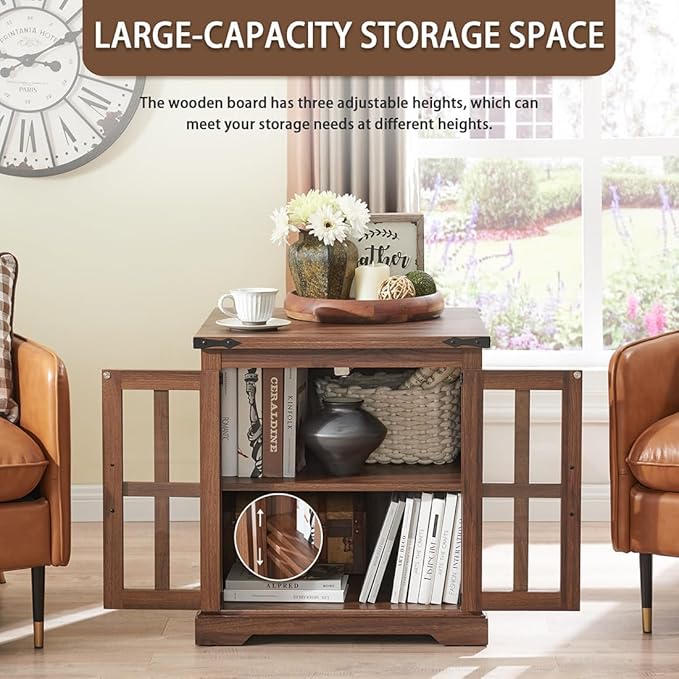 - Eye-catching Farmhouse design : Give your space a dose of country style with this Natural Wood Farmhouse End Table! You’ll love the rustic details of its tempered glass door and barn door design On the side. Its natural wood finish is sure to lighten up your space.