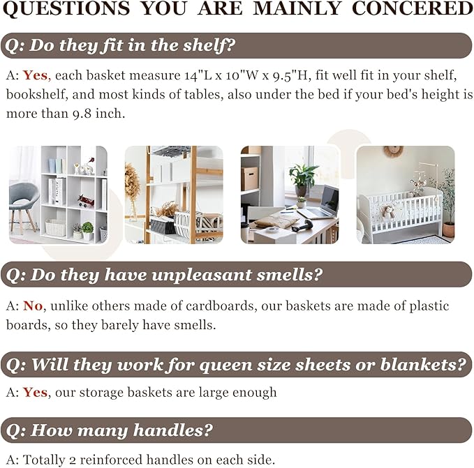 - 【PREMIUM QUALITY】 These bins for organization are made of stiff plastic boards on all sides and bottom, so these storage cubes could remain sturdy for years, stackable, and odorless in enclosed space. Durable non-woven fabric ensures these organizer baskets long-lasting. The organizer bin is stitched with 2 handles for a firm grip and easy carrying.
