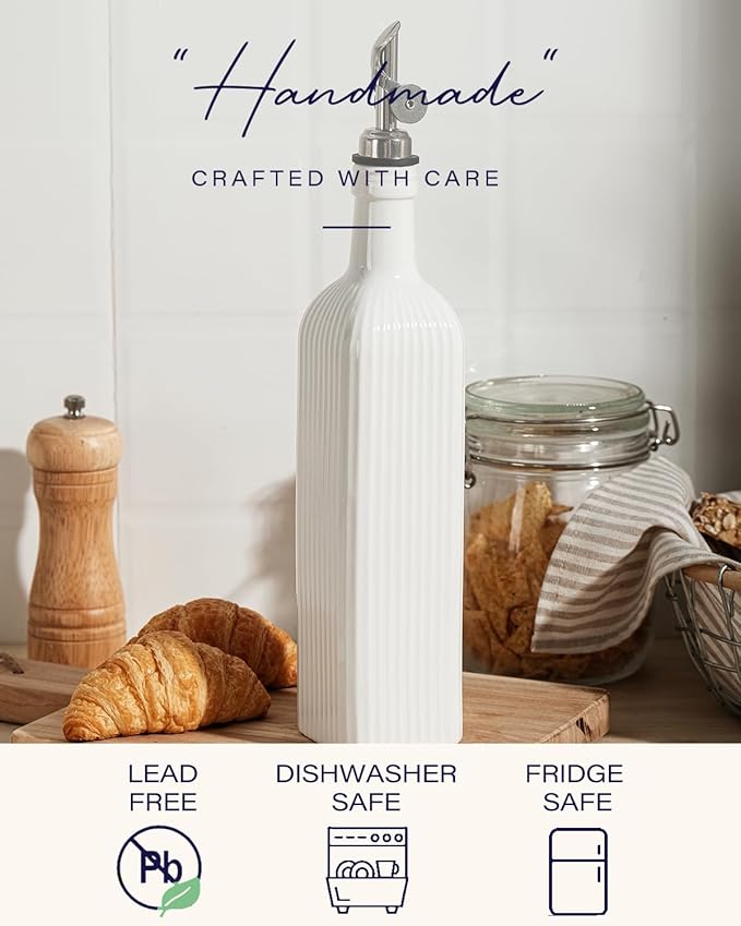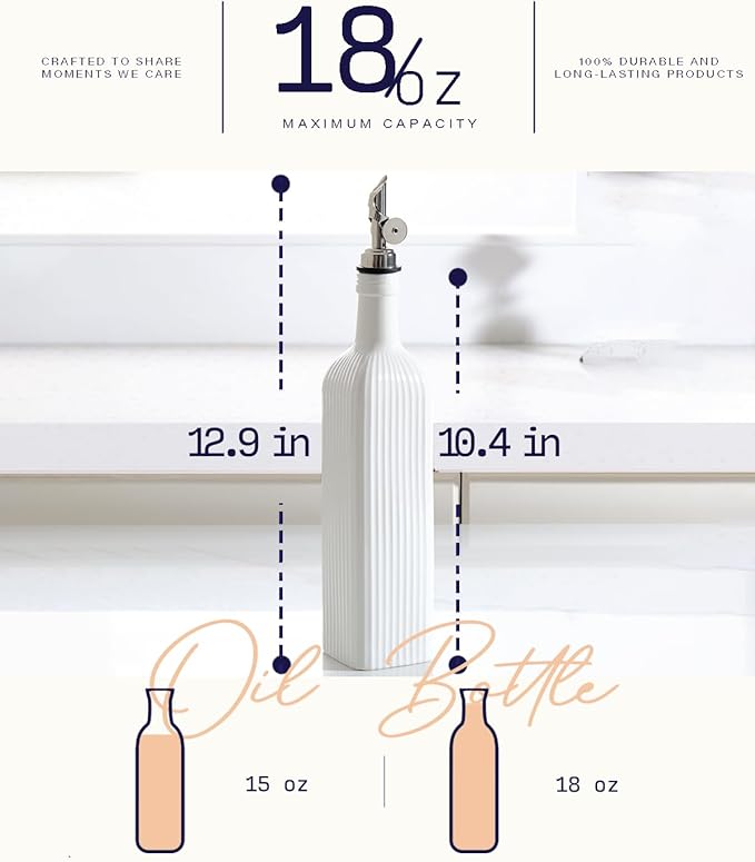 - [Elegant Design] A sleek white ceramic cooking oil dispenser with embossed stripes, creating a visually appealing and tactile experience for your kitchen or dining table