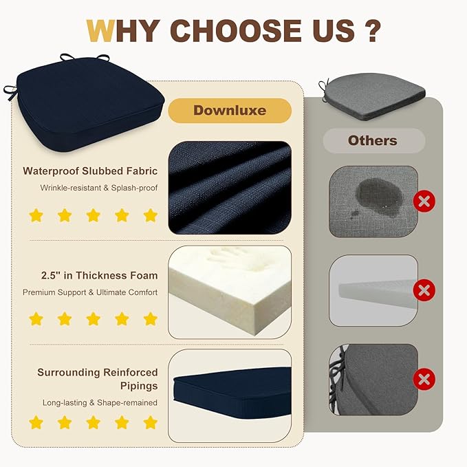 downluxe Chair Cushions for Dining Chairs, Waterproof Kitchen Chair Pads, Non-Slip Dining Seat Cushion with Ties, 17" x 16" x 2.5", Navy, 6 Pack